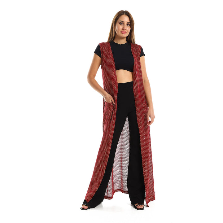 • Women's long sleeveless cardigan with a stylish and comfortable perforated design.