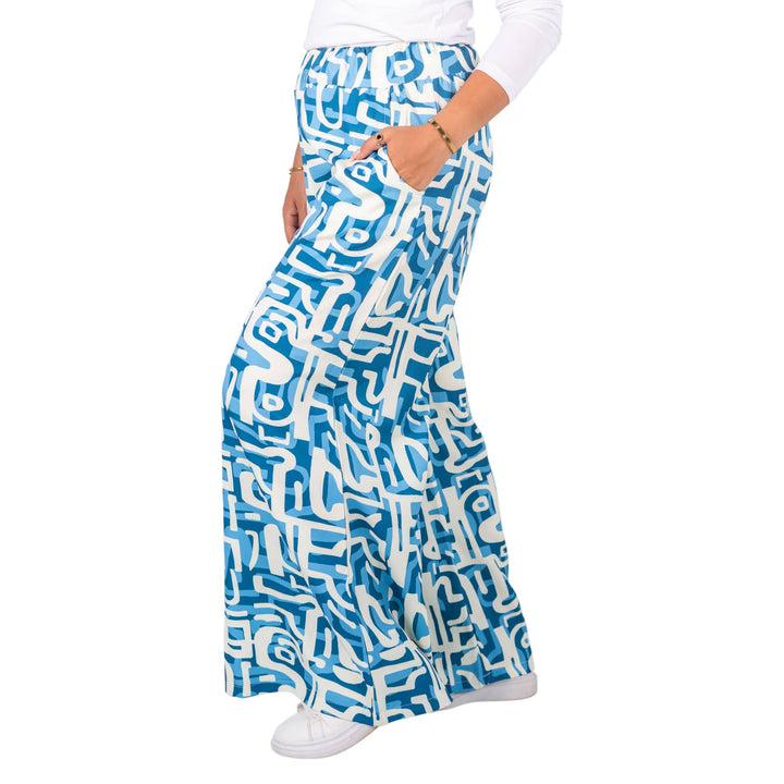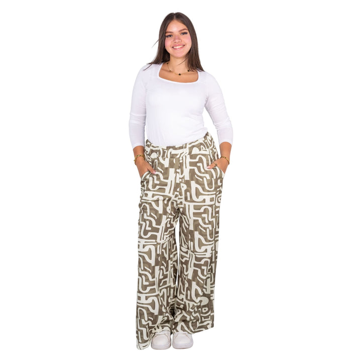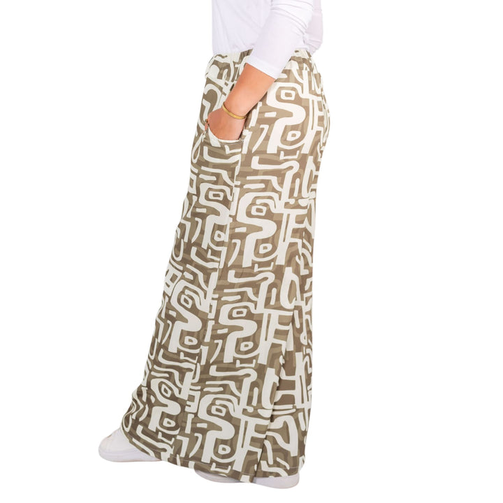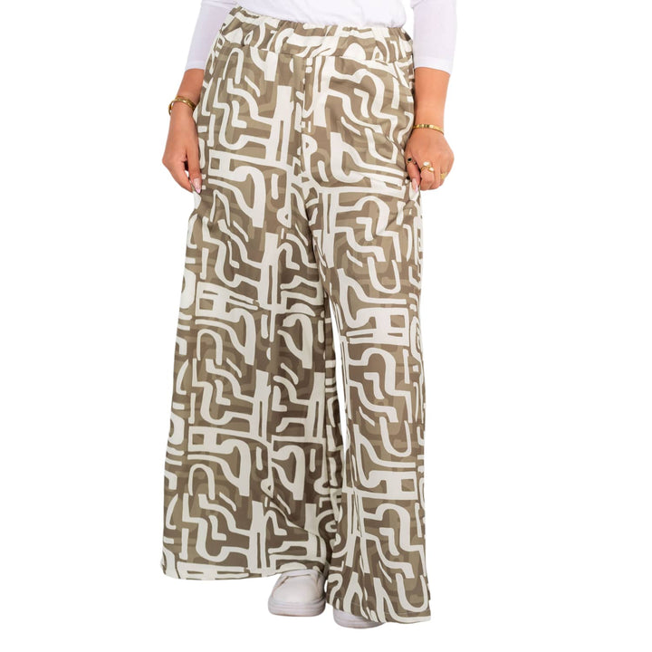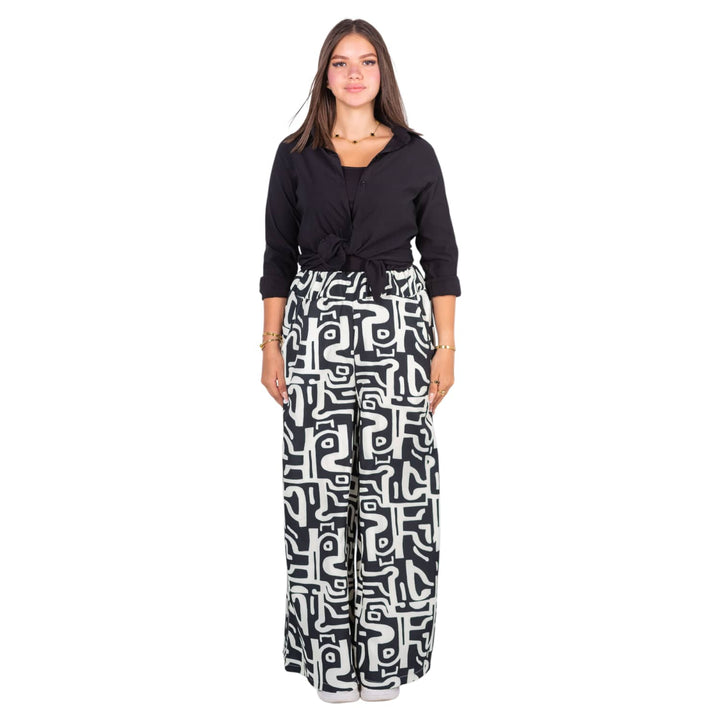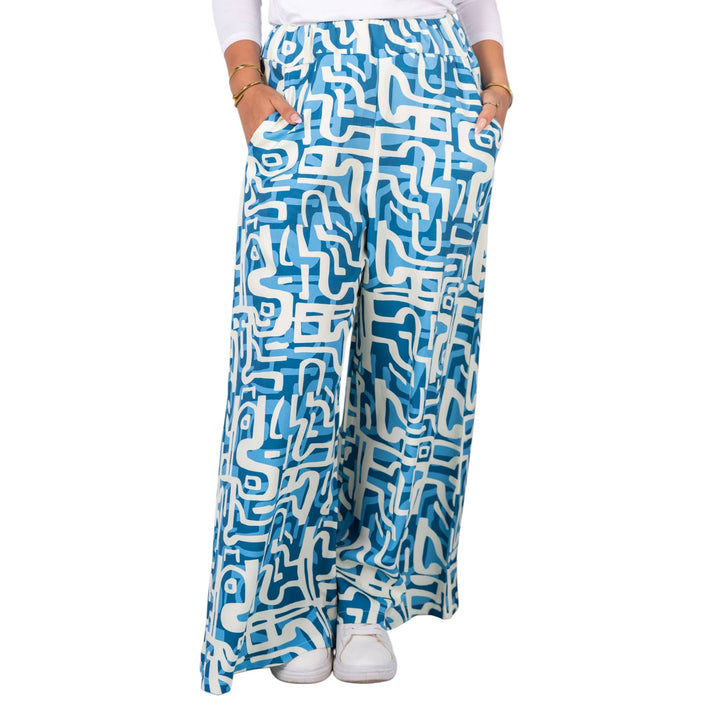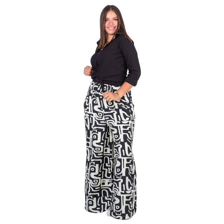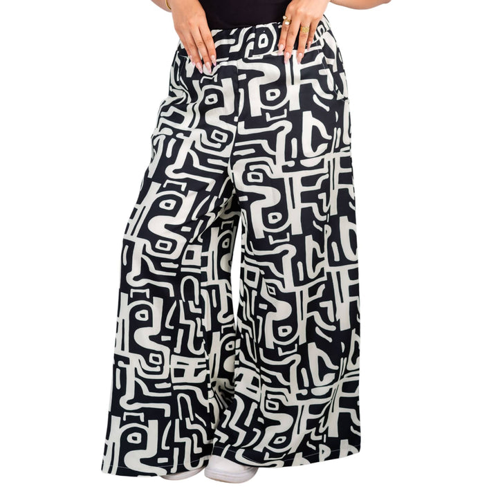• تصميم الأرجل فائقة الإتساع مع طباعة تجريدية عصرية يضيفان لمسة مميزة تتماشى مع أحدث اتجاهات الموضة، بينما يوفّر الحزام المطاطي عند الخصر ثباتًا وراحة مثالية.
