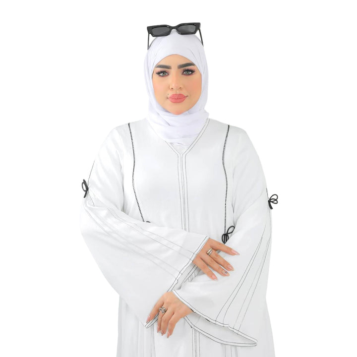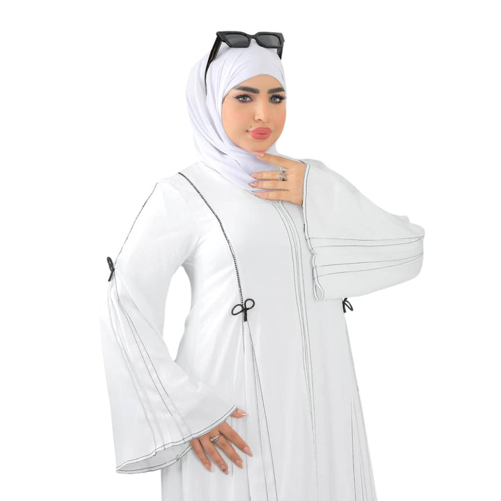 • اكتشفي أناقة عملية ومريحة مع عباية العمرة البيضاء المصممة خصيصًا لتمنحك سهولة الحركة وخفة الإرتداء أثناء أداء العمرة.