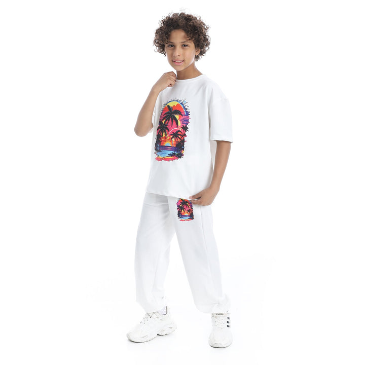 • التيشيرت بأكمام قصيرة وياقة مستديرة لسهولة الإرتداء في الأجواء الدافئة، بينما يأتي البنطال بخصر مطاطي يمنح ثباتًا ومرونة طوال فترة الإستخدام.