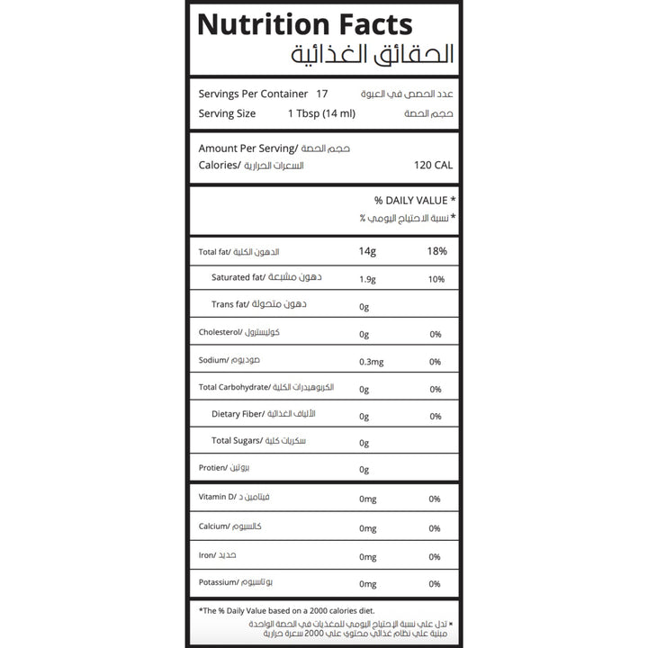 • تركيبة طبيعية 100% للحفاظ على نقاء الزيت وفوائده الغذائية.