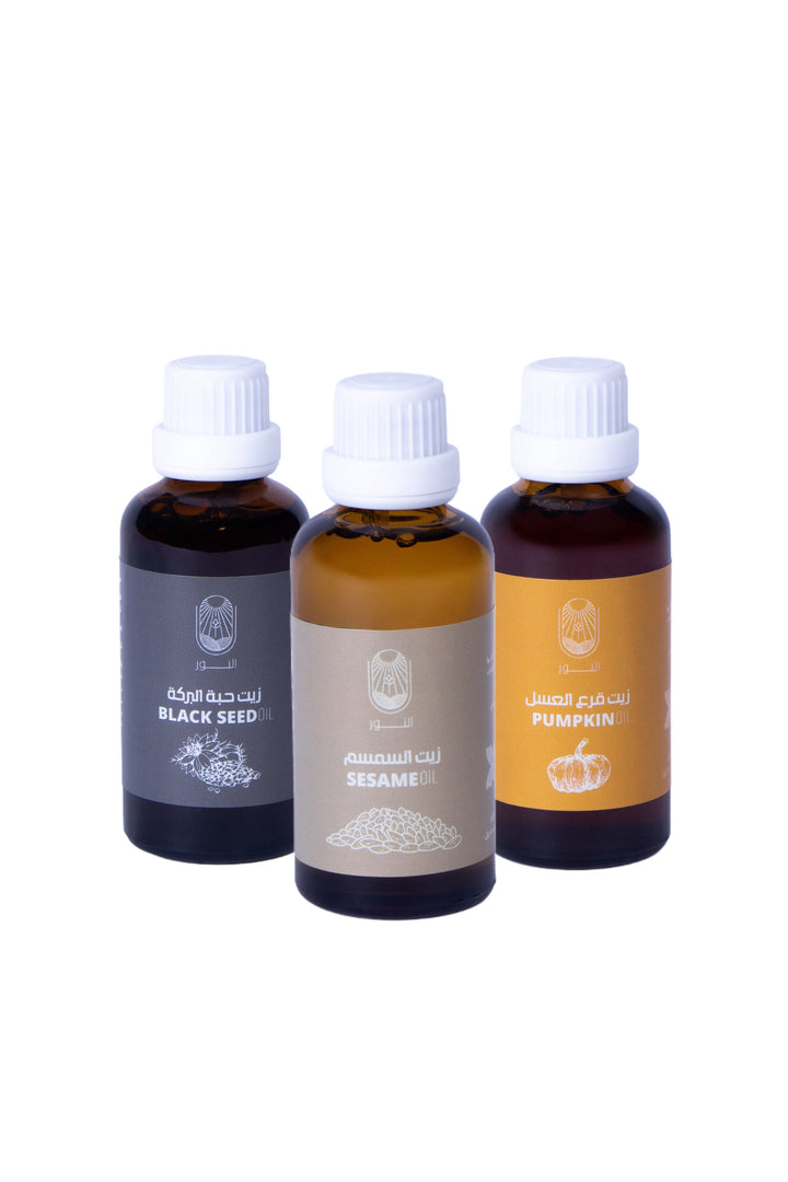 • باقة من ثلاثة زيوت طبيعية مغذية زيت الحبة السوداء وزيت السمسم وزيت بذور اليقطين.
