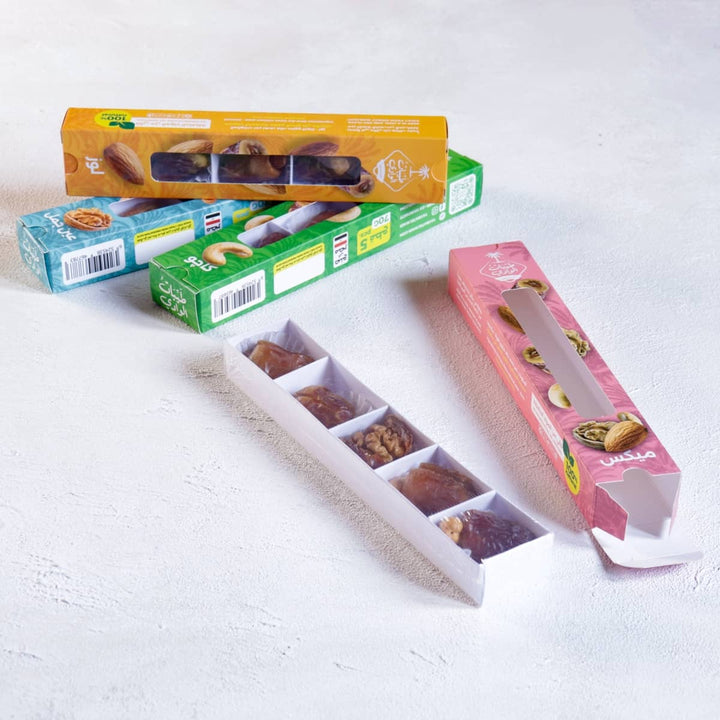يحتوي البار على 5 تمرات جامبو من أجود أنواع التمور منزوعة النوى ومحشوة بحبات كاجو طازجة.