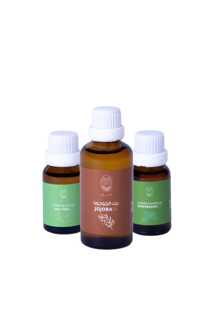 • ١٥مل من زيت شجرة الشاي - ١٥مل من زيت النعناع - ١٥مل من زيت الجوجوبا.