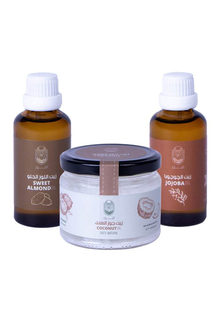 • ٢٥٠مل من زيت جوز الهند - ٥٠ مل من زيت الجوجوبا - ٥٠مل زيت اللوز الحلو.
