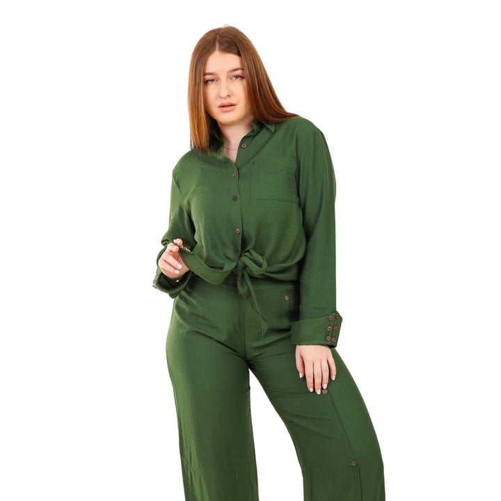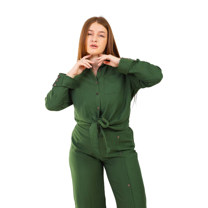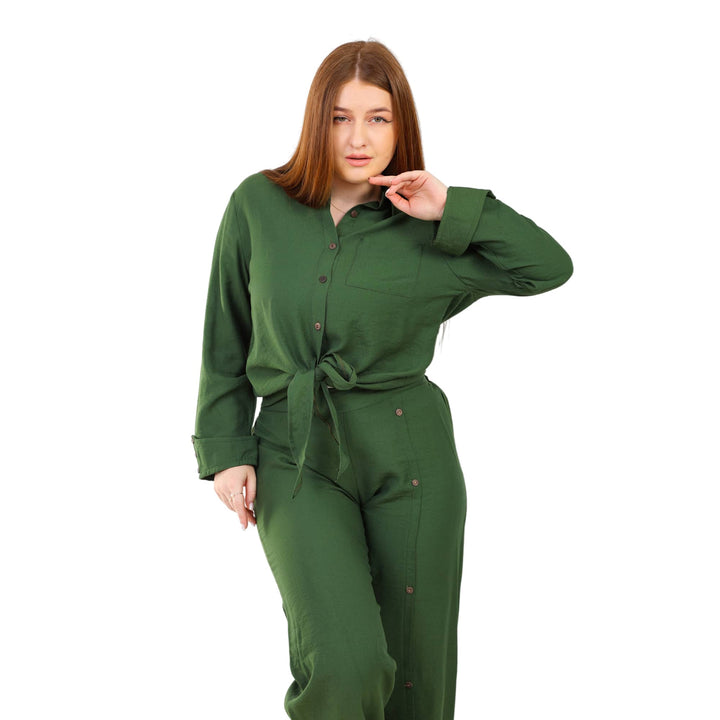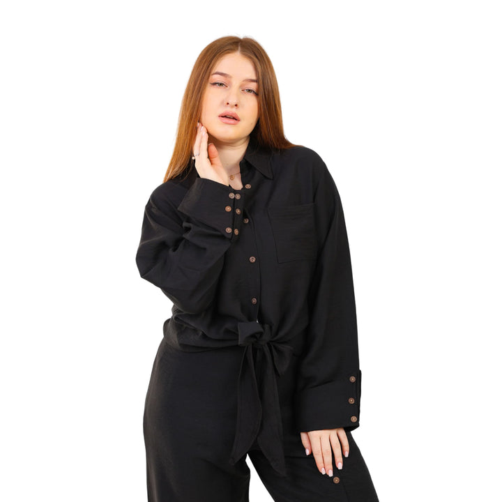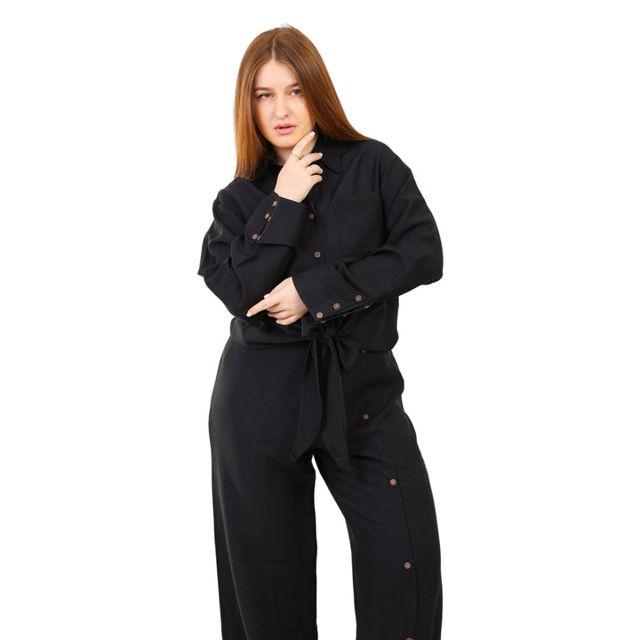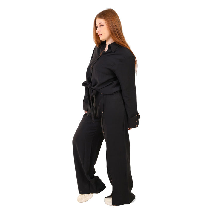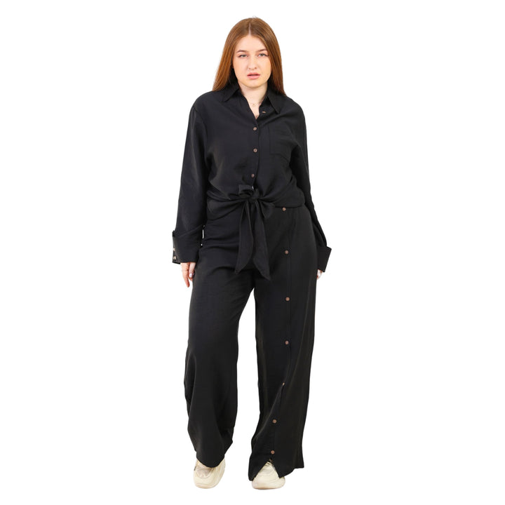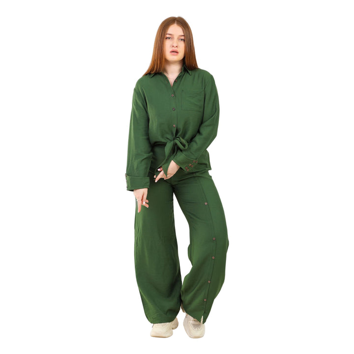 تتكوّن من جاكيت برباط أمامي بتفصيلة عقدة تضيف لمسة أنثوية ناعمة وأساور بأزرار أنيقة، مع بنطال واسع الأرجل مزين بأزرار تضفي مظهراً عصرياً انسيابياً. يمكنك تنسيقها بسهولة مع تيشيرت أو بلوزة بسيطة للحصول على إطلالة يومية مريحة وراقية في الوقت ذاته.